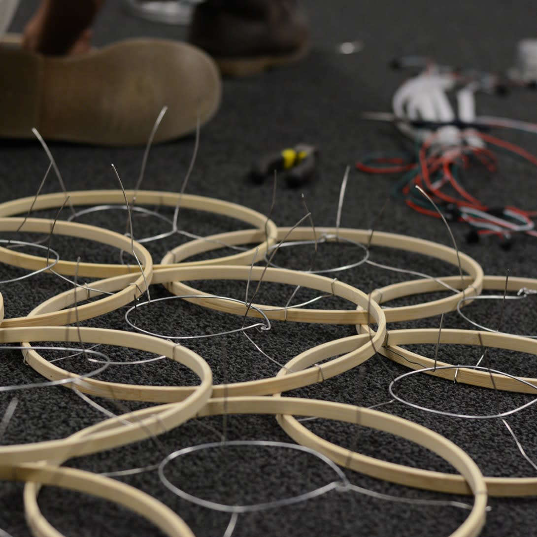 The installation used two Arduino microcontrollers, one to control each window. The two windows communicated wirelessly through an infrared LED. Each circle of the installation contained 10 RGB LEDs; with 24 circles, we individually controlled 240 lights.