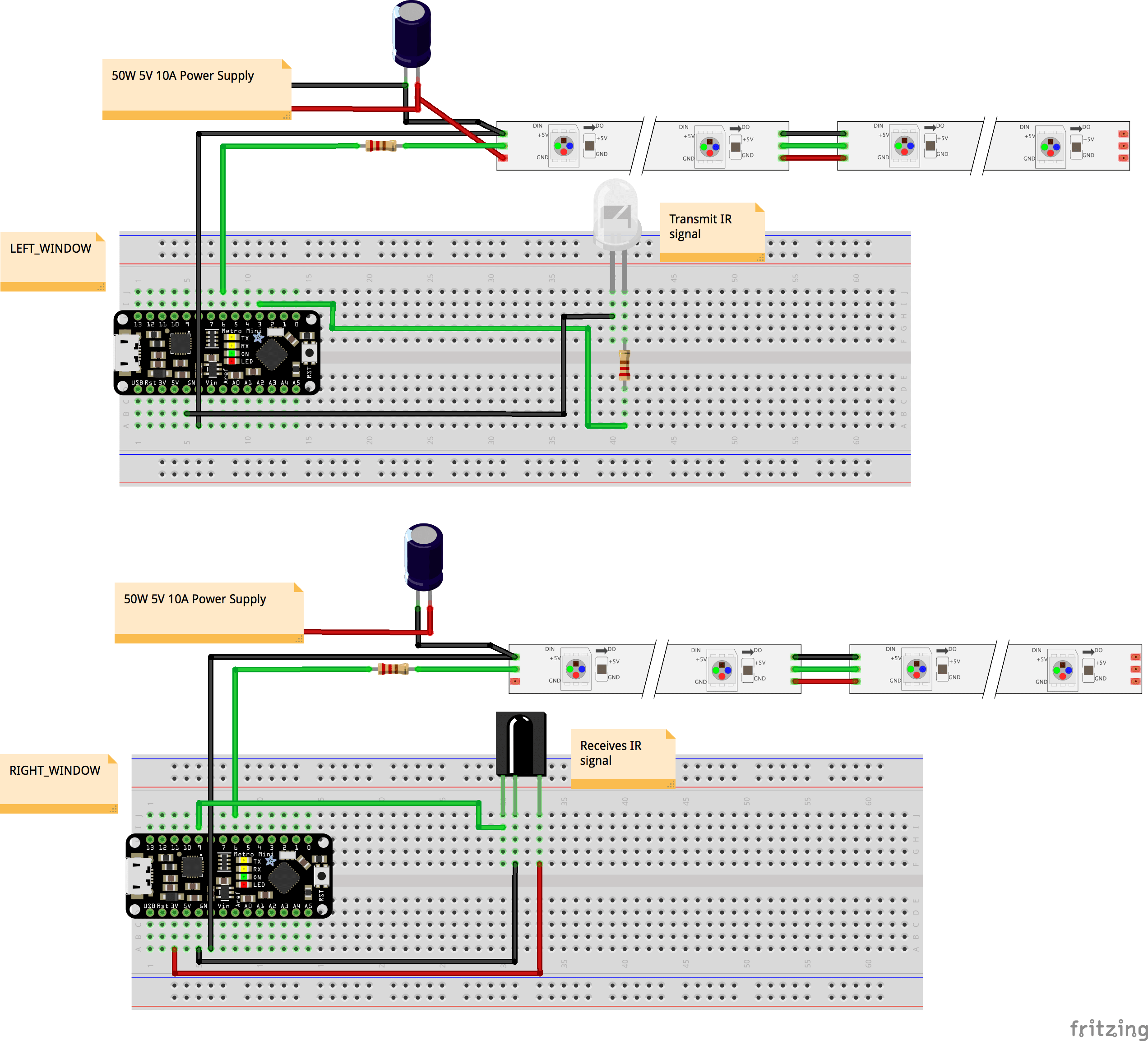 The IRremote library allows each of the windows to communicate wirelessly with each other. Think of it this way: one Arduino acts as a remote control while the other acts as a cable box. The library handles the complex timings required for different protocols, so we only needed around five lines of code to handle communicating and reading the transmitted data.
