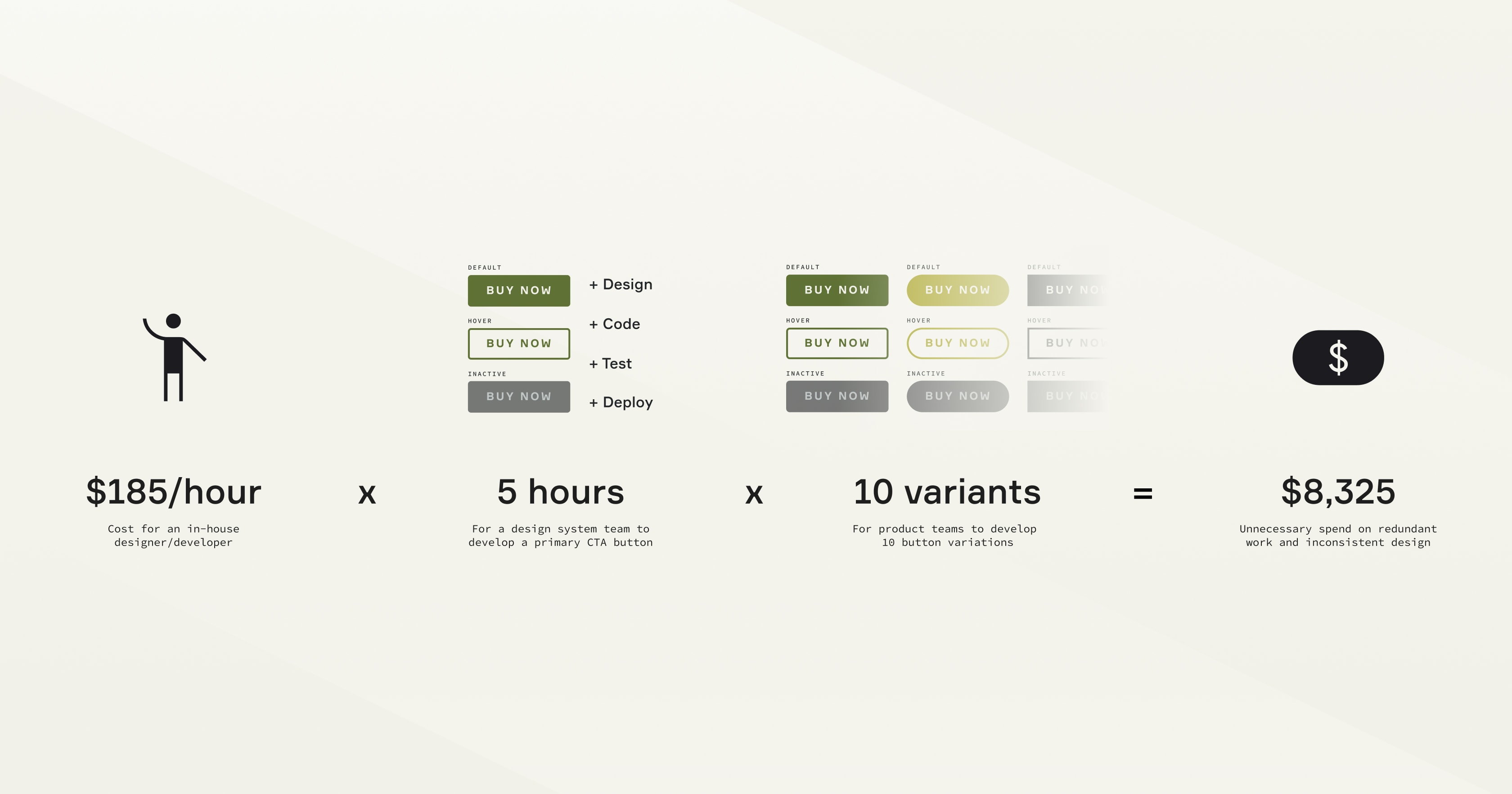 Not only do you wind up with visual inconsistencies, but you’ve duplicated your efforts and wasted resources. If each of those buttons took 5 hours, you’re now looking at 50 hours spent on essentially one button. If you assume an hourly rate of $185, that’s over $8000 to make one button!