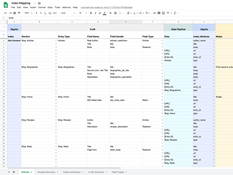 When working in Algolia, it is important to consider the maximum size of objects in the index as there are hard limits. Additionally, long objects have the potential to increase latency and reduce relevancy. For more on long documents in Algolia, see their FAQs. At the end of this step we should have a clear mapping of how each field available to us in the CMS maps to a specific attribute in the search indexes.