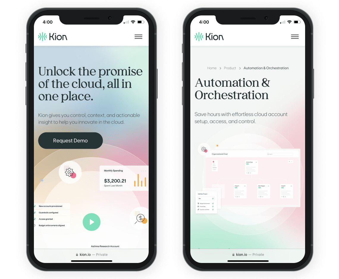 Kion, formerly cloudtamer.io, underwent a complete rebrand by Focus Lab. The rebrand included a new name, brand identity, and web designs. Foster Made was brought in for site development – to bring Focus Lab’s designs to life and replace Wordpress with a more adaptable and future-forward tech stack.