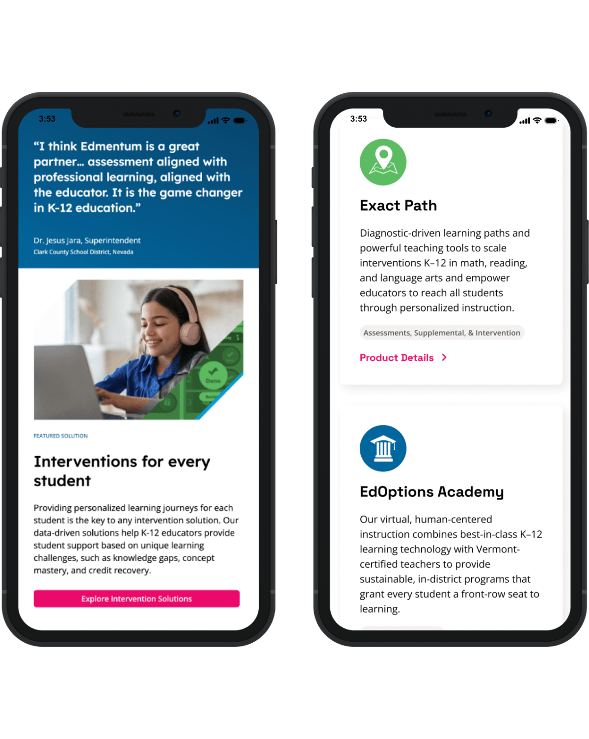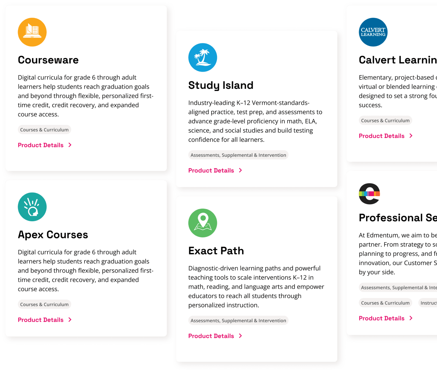 Edmentum provided a fixed deadline to accommodate in-house development of their new site. This required an expedited research phase that began with a discovery workshop and included user journey mapping and stakeholder interviews. We learned that outstanding customer care is a key differentiator for the Edmentum brand. We also identified the need to help visitors better understand Edmentum’s many products and their benefits.