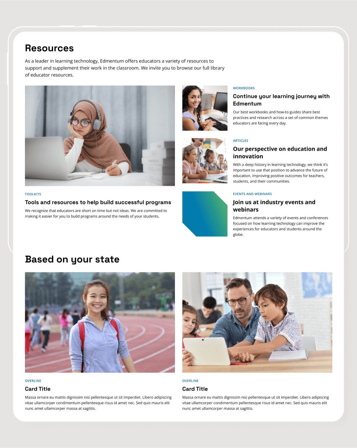 The new site was designed to better communicate who Edmentum is as a brand and to clarify and simplify its messaging. By identifying where audience priorities overlap, we were able to organize and prioritize content based on user needs. Similarly, we took into consideration school district and educator requirements for state standards, creating a dynamic experience that changes based on the visitor’s location.