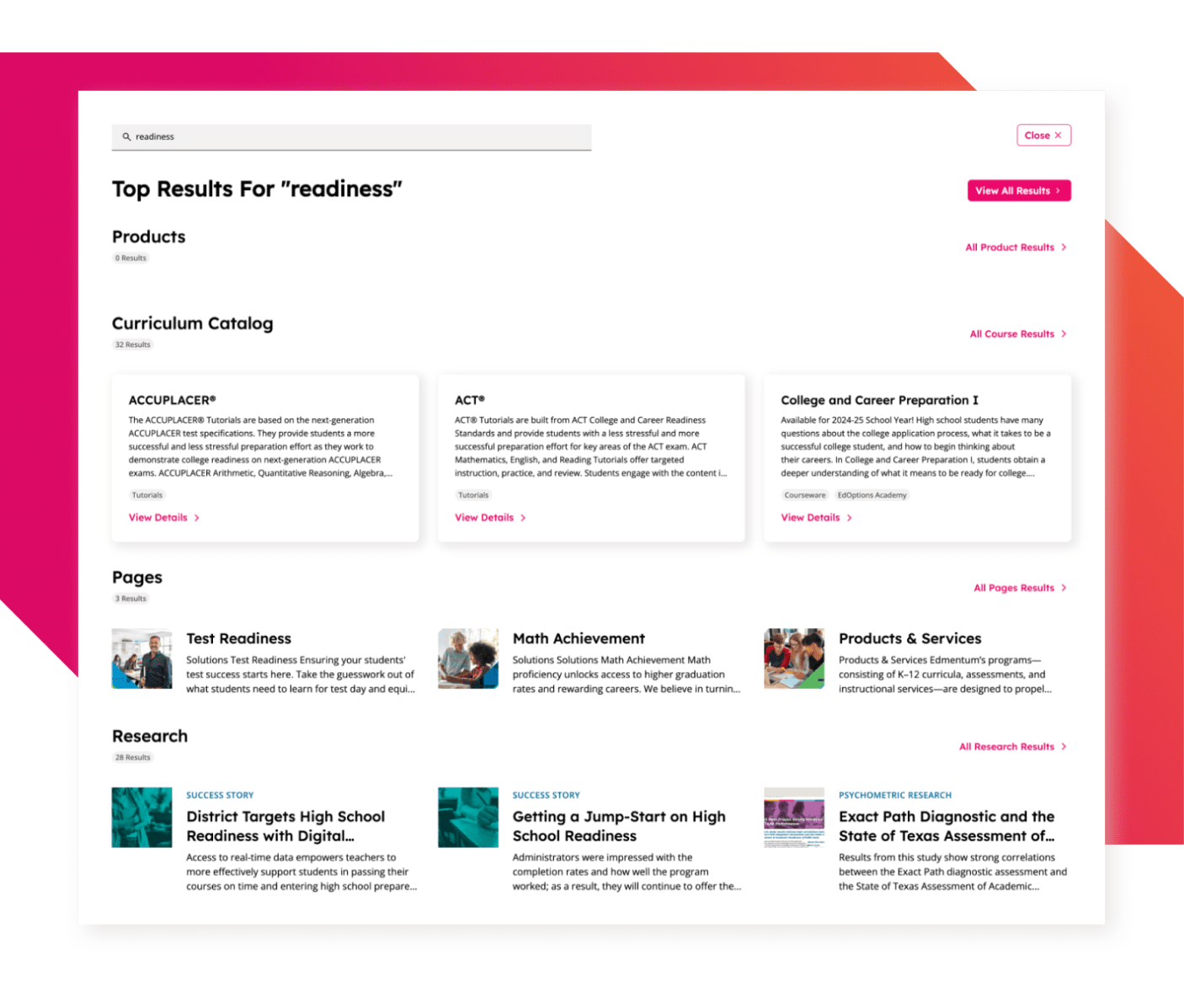 Although Edmentum’s development team will be building the new site, Foster Made was brought on board to provide guidance around search, accessibility, site optimization, and quality assurance. Specifically, for search, Foster Made recommended Algolia, a best-in-class composable search platform, and proposed a three-phase approach that would incorporate more advanced AI features over time.