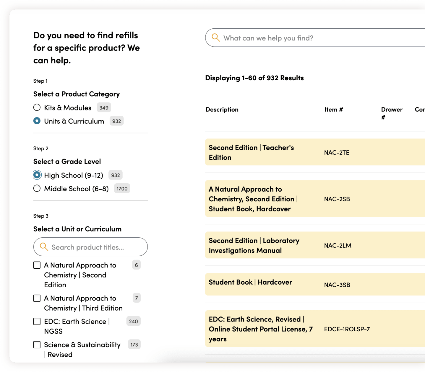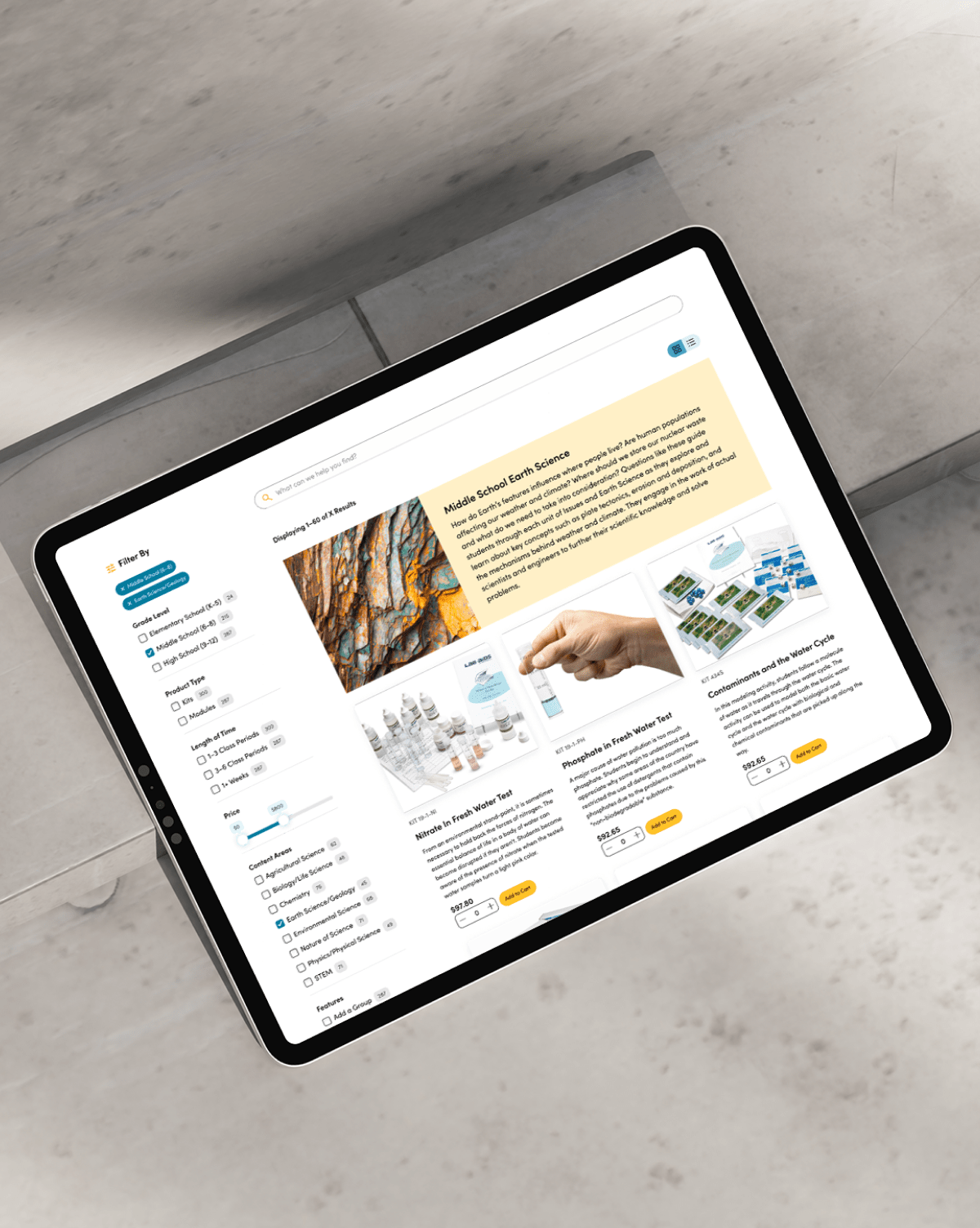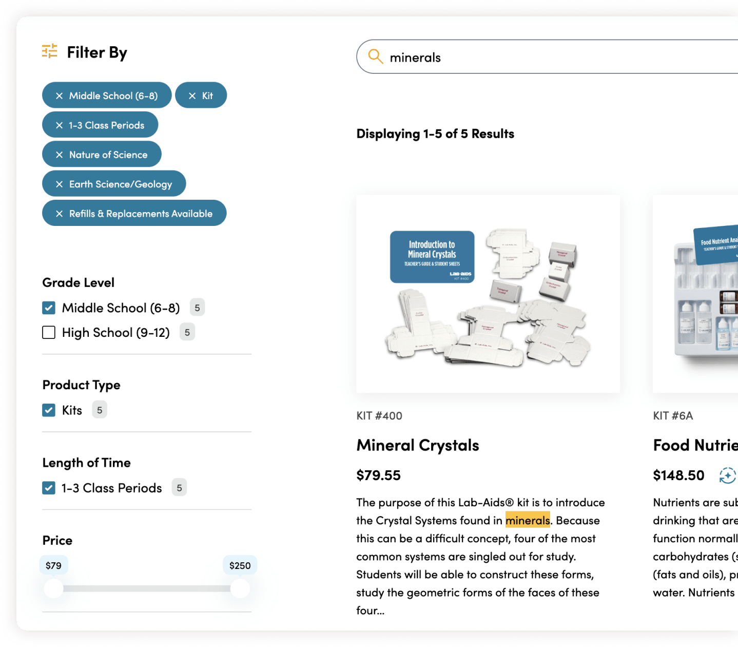 Through intensive workshops, it became clear Lab-Aids needed to rethink their ecommerce experience. Over time, the online store had been patched and features had been added ad hoc. As a result, data systems had become clunky and complicated. On the front end, product information was difficult to find, search was broken, and purchase paths were complex, leading to missed sales opportunities. We needed to make it easy for Lab Aid’s primary users, teachers, to locate science product packages, add them to carts, and then share those carts with administrators for final purchasing.