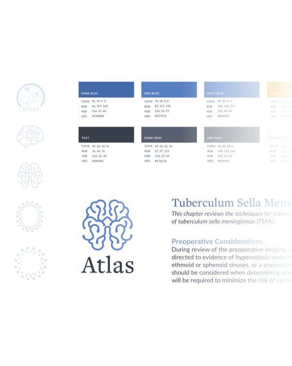 The design and launch of the Atlas mobile app prompted the development of a new logo design that could function well across the app, website, and beyond. We explored a range of concepts, from concrete to conceptual, ultimately designing a stylized mark of the brain that scales well and represents the organization’s innovative work in neurosurgical education. We used this as an opportunity to refresh the Atlas’ other brand elements, documenting logo use, color, and typography in a new style guide.